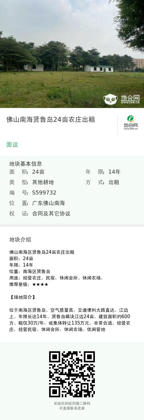位于南海区贤鲁岛。空气质量高。交通便利大路直达。江边上。年限长达14年。贤鲁岛稀决江边24亩。建筑面积约600方。租仅30万/年,或集体转让135万元。非常合适。经营农庄,经营民宿,休闲会所,休闲农场。优闲营地